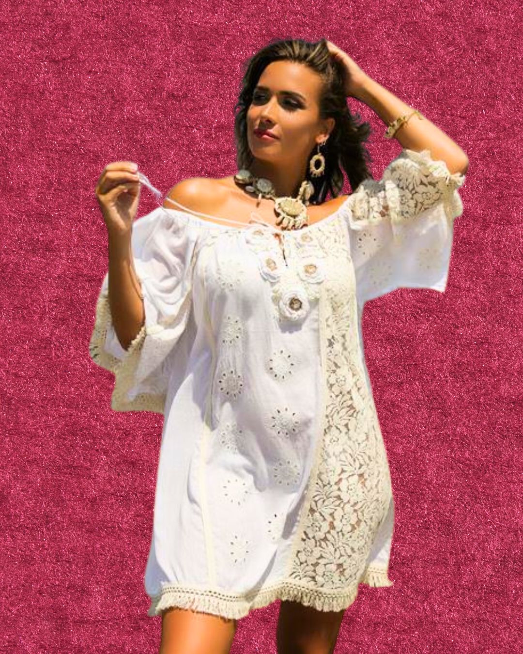 Combina la delicadeza del encaje con el encanto artesanal del bordado. Su diseño tipo off-shoulder, mangas amplias y caída suelta crean una silueta cómoda y femenina. Disponible en S, M y L